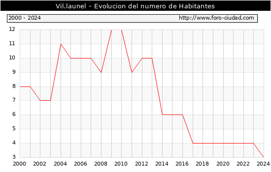 el numero de habitantes en Vil.launel era de 3, 1 habitantes menos que el en el año 2023. En el grafico siguiente se puede ver cuantos habitantes tiene Vil.launel a lo largo de los años.