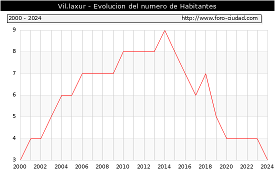 el numero de habitantes en Vil.laxur era de 3, 1 habitantes menos que el en el año 2023. En el grafico siguiente se puede ver cuantos habitantes tiene Vil.laxur a lo largo de los años.