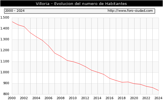 el numero de habitantes en Villoria era de 834, 28 habitantes menos que el en el año 2023. En el grafico siguiente se puede ver cuantos habitantes tiene Villoria a lo largo de los años.