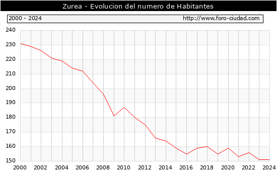 Segun los datos publicados por el INE a 1 de Enero de 2024 el numero de habitantes en Zurea era de 151, igual numero de habitantes que el en el año 2023. En el grafico siguiente se puede ver cuantos habitantes tiene Zurea a lo largo de los años.