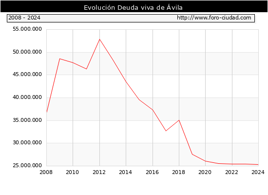 | Ávila - Deuda viva del Ayuntamiento a 31/12/2024 Ávila - Deuda viva del Ayuntamiento a 31/12/2024 Segun el Ministerio de Economia y Hacienda el Ayuntamiento de Ávila a 31/12/2024 posee una deuda de 25.371.000 € . La deuda viva a 31/12/2023 ascendia a 25.378.000 € por lo que en el ultimo año la deuda se redujo en -7.000 €.