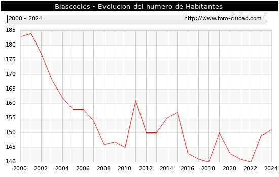 el numero de habitantes en Blascoeles era de 151, 2 habitantes mas que el en el año 2023. En el grafico siguiente se puede ver cuantos habitantes tiene Blascoeles a lo largo de los años.