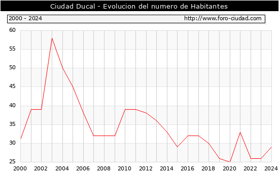 el numero de habitantes en Ciudad Ducal era de 29, 3 habitantes mas que el en el año 2023. En el grafico siguiente se puede ver cuantos habitantes tiene Ciudad Ducal a lo largo de los años.