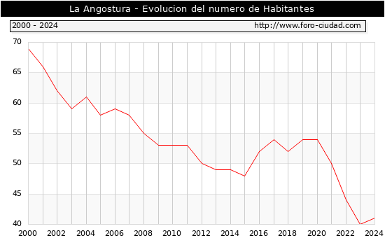 el numero de habitantes en La Angostura era de 41, 1 habitantes mas que el en el año 2023. En el grafico siguiente se puede ver cuantos habitantes tiene La Angostura a lo largo de los años.