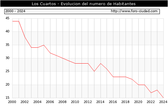 el numero de habitantes en Los Cuartos era de 15, 3 habitantes menos que el en el año 2023. En el grafico siguiente se puede ver cuantos habitantes tiene Los Cuartos a lo largo de los años.