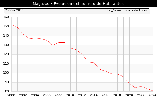 el numero de habitantes en Magazos era de 81, 2 habitantes menos que el en el año 2023. En el grafico siguiente se puede ver cuantos habitantes tiene Magazos a lo largo de los años.