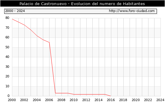 el numero de habitantes en Palacio de Castronuevo era de 0, igual numero de habitantes que el en el año 2023. En el grafico siguiente se puede ver cuantos habitantes tiene Palacio de Castronuevo a lo largo de los años.