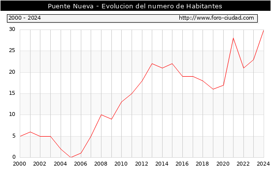 el numero de habitantes en Puente Nueva era de 30, 7 habitantes mas que el en el año 2023. En el grafico siguiente se puede ver cuantos habitantes tiene Puente Nueva a lo largo de los años.