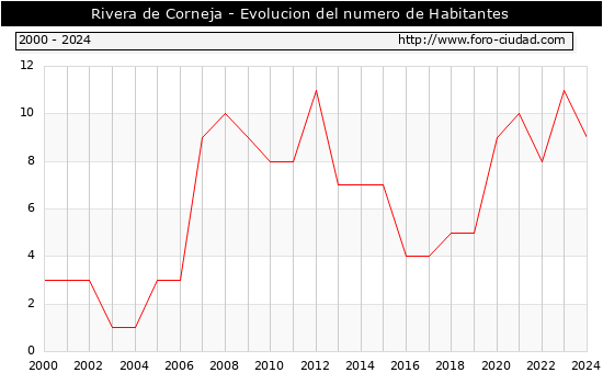 el numero de habitantes en Rivera de Corneja era de 9, 2 habitantes menos que el en el año 2023. En el grafico siguiente se puede ver cuantos habitantes tiene Rivera de Corneja a lo largo de los años.