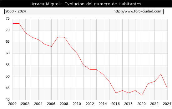 el numero de habitantes en Urraca-Miguel era de 45, 6 habitantes menos que el en el año 2023. En el grafico siguiente se puede ver cuantos habitantes tiene Urraca-Miguel a lo largo de los años.