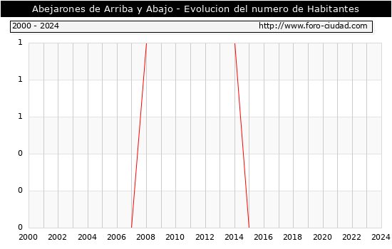 el numero de habitantes en Abejarones de Arriba y Abajo era de 0, igual numero de habitantes que el en el año 2023. En el grafico siguiente se puede ver cuantos habitantes tiene Abejarones de Arriba y Abajo a lo largo de los años.