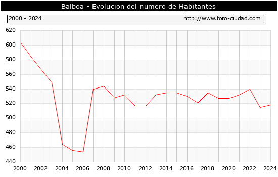 el numero de habitantes en Balboa era de 518, 3 habitantes mas que el en el año 2023. En el grafico siguiente se puede ver cuantos habitantes tiene Balboa a lo largo de los años.