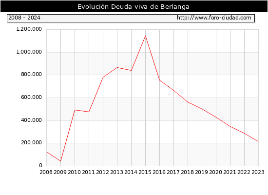 Berlanga - Deuda viva del Ayuntamiento a 31/12/2024 Berlanga - Deuda viva del Ayuntamiento a 31/12/2024 Segun el Ministerio de Economia y Hacienda el Ayuntamiento de Berlanga a 31/12/2024 posee una deuda de 60.000 € . La deuda viva a 31/12/2023 ascendia a 216.000 € por lo que en el ultimo año la deuda se redujo en -156.000 €. ![]()