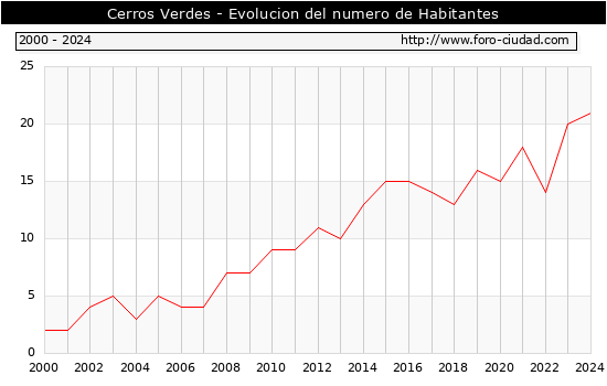 el numero de habitantes en Cerros Verdes era de 21, 1 habitantes mas que el en el año 2023. En el grafico siguiente se puede ver cuantos habitantes tiene Cerros Verdes a lo largo de los años.