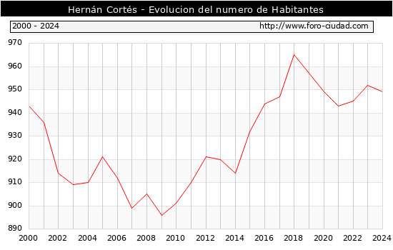 el numero de habitantes en Hernán Cortés era de 949, 3 habitantes menos que el en el año 2023. En el grafico siguiente se puede ver cuantos habitantes tiene Hernán Cortés a lo largo de los años.