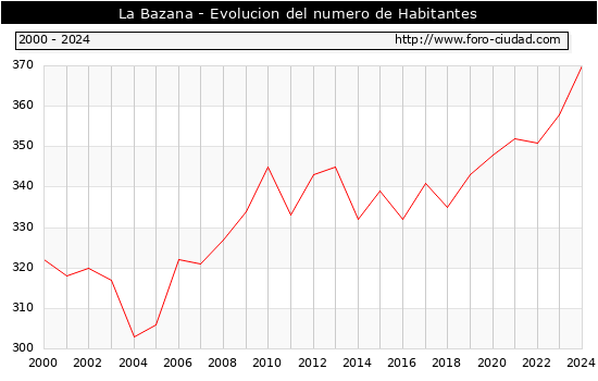 el numero de habitantes en La Bazana era de 370, 12 habitantes mas que el en el año 2023. En el grafico siguiente se puede ver cuantos habitantes tiene La Bazana a lo largo de los años.