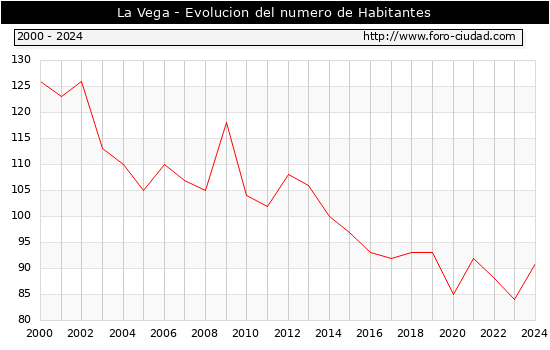 el numero de habitantes en La Vega era de 91, 7 habitantes mas que el en el año 2023. En el grafico siguiente se puede ver cuantos habitantes tiene La Vega a lo largo de los años.
