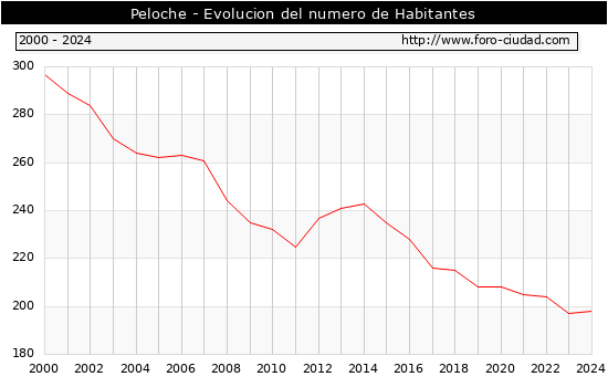 el numero de habitantes en Peloche era de 198, 1 habitantes mas que el en el año 2023. En el grafico siguiente se puede ver cuantos habitantes tiene Peloche a lo largo de los años.
