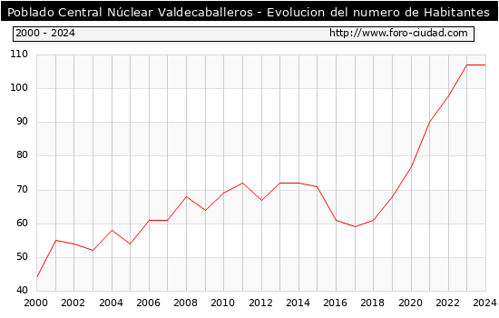 el numero de habitantes en Poblado Central Núclear Valdecaballeros era de 107, igual numero de habitantes que el en el año 2023. En el grafico siguiente se puede ver cuantos habitantes tiene Poblado Central Núclear Valdecaballeros a lo largo de los años.