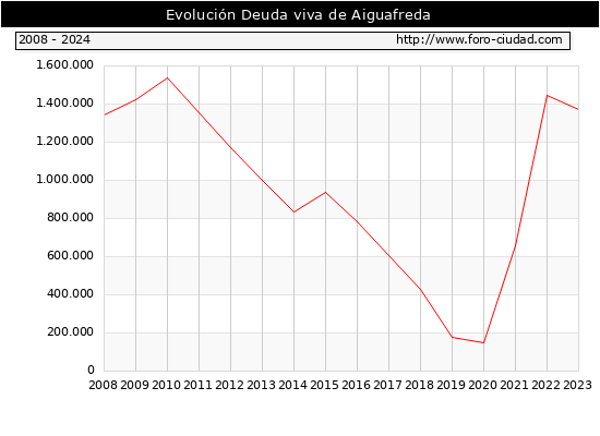 Aiguafreda - Deuda viva del Ayuntamiento a 31/12/2024 Aiguafreda - Deuda viva del Ayuntamiento a 31/12/2024 Segun el Ministerio de Economia y Hacienda el Ayuntamiento de Aiguafreda a 31/12/2024 posee una deuda de 1.211.000 € . La deuda viva a 31/12/2023 ascendia a 1.369.000 € por lo que en el ultimo año la deuda se redujo en -158.000 €. ![]()