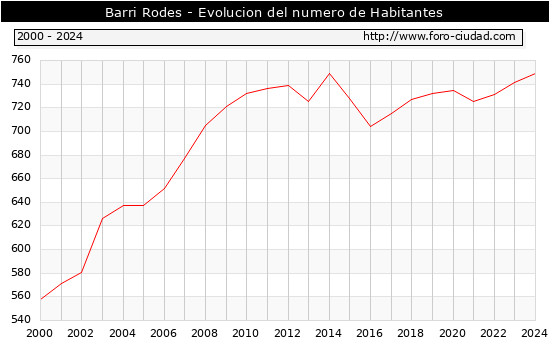 el numero de habitantes en Barri Rodes era de 749, 8 habitantes mas que el en el año 2023. En el grafico siguiente se puede ver cuantos habitantes tiene Barri Rodes a lo largo de los años.