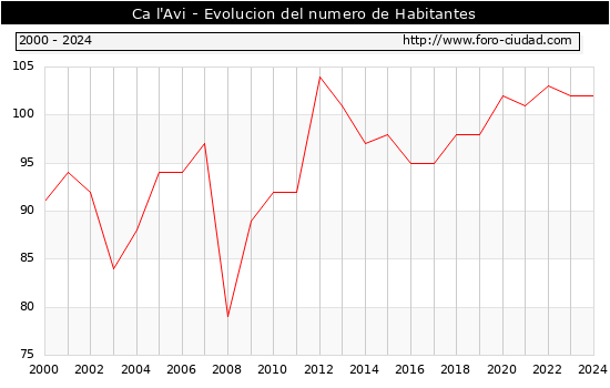 el numero de habitantes en Ca l'Avi era de 102, igual numero de habitantes que el en el año 2023. En el grafico siguiente se puede ver cuantos habitantes tiene Ca l'Avi a lo largo de los años.