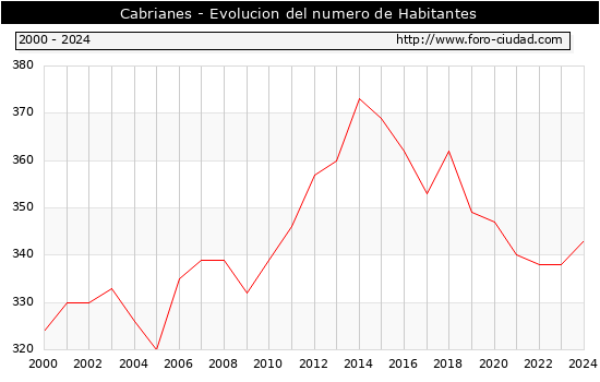 el numero de habitantes en Cabrianes era de 343, 5 habitantes mas que el en el año 2023. En el grafico siguiente se puede ver cuantos habitantes tiene Cabrianes a lo largo de los años.
