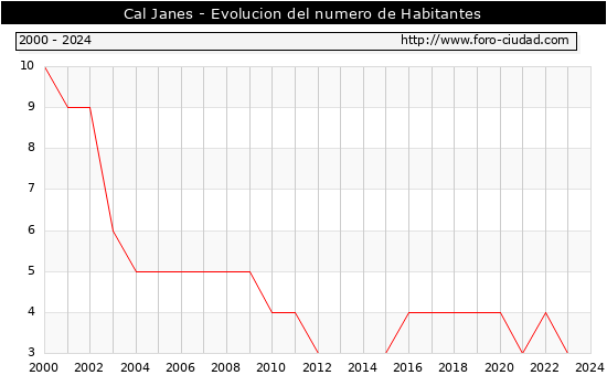 el numero de habitantes en Cal Janes era de 3, igual numero de habitantes que el en el año 2023. En el grafico siguiente se puede ver cuantos habitantes tiene Cal Janes a lo largo de los años.