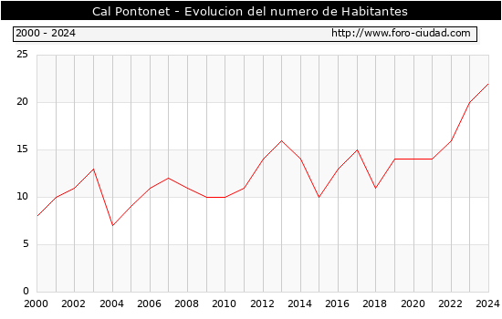el numero de habitantes en Cal Pontonet era de 22, 2 habitantes mas que el en el año 2023. En el grafico siguiente se puede ver cuantos habitantes tiene Cal Pontonet a lo largo de los años.