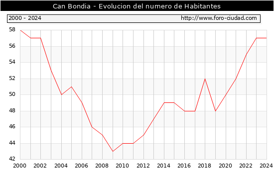 el numero de habitantes en Can Bondia era de 57, igual numero de habitantes que el en el año 2023. En el grafico siguiente se puede ver cuantos habitantes tiene Can Bondia a lo largo de los años.