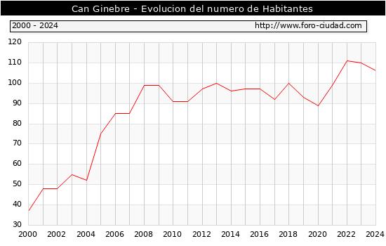 el numero de habitantes en Can Ginebre era de 106, 4 habitantes menos que el en el año 2023. En el grafico siguiente se puede ver cuantos habitantes tiene Can Ginebre a lo largo de los años.