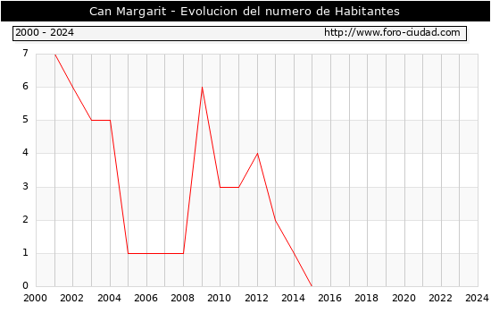 el numero de habitantes en Can Margarit era de 0, igual numero de habitantes que el en el año 2023. En el grafico siguiente se puede ver cuantos habitantes tiene Can Margarit a lo largo de los años.