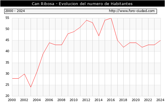 el numero de habitantes en Can Ribosa era de 45, 2 habitantes mas que el en el año 2023. En el grafico siguiente se puede ver cuantos habitantes tiene Can Ribosa a lo largo de los años.