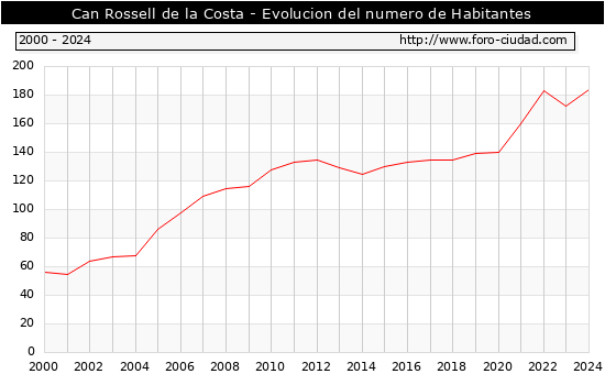 el numero de habitantes en Can Rossell de la Costa era de 184, 12 habitantes mas que el en el año 2023. En el grafico siguiente se puede ver cuantos habitantes tiene Can Rossell de la Costa a lo largo de los años.