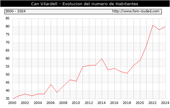 el numero de habitantes en Can Vilardell era de 80, 2 habitantes mas que el en el año 2023. En el grafico siguiente se puede ver cuantos habitantes tiene Can Vilardell a lo largo de los años.