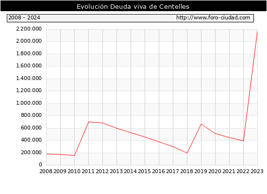 Centelles - Deuda viva del Ayuntamiento a 31/12/2024 Centelles - Deuda viva del Ayuntamiento a 31/12/2024 Segun el Ministerio de Economia y Hacienda el Ayuntamiento de Centelles a 31/12/2024 posee una deuda de 2.009.000 € . La deuda viva a 31/12/2023 ascendia a 2.185.000 € por lo que en el ultimo año la deuda se redujo en -176.000 €. ![]()