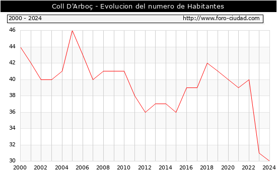 el numero de habitantes en Coll D'Arboç era de 30, 1 habitantes menos que el en el año 2023. En el grafico siguiente se puede ver cuantos habitantes tiene Coll D'Arboç a lo largo de los años.