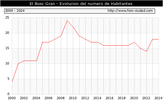el numero de habitantes en El Bosc Gran era de 18, igual numero de habitantes que el en el año 2023. En el grafico siguiente se puede ver cuantos habitantes tiene El Bosc Gran a lo largo de los años.