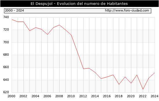 el numero de habitantes en El Despujol era de 652, 9 habitantes mas que el en el año 2023. En el grafico siguiente se puede ver cuantos habitantes tiene El Despujol a lo largo de los años.