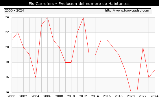el numero de habitantes en Els Garrofers era de 17, 1 habitantes mas que el en el año 2023. En el grafico siguiente se puede ver cuantos habitantes tiene Els Garrofers a lo largo de los años.