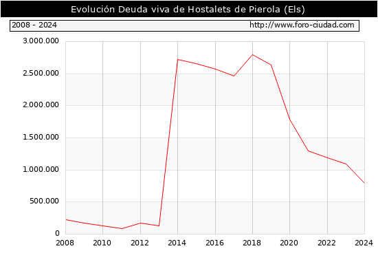 Els Hostalets de Pierola - Deuda viva del Ayuntamiento a 31/12/2024 Els Hostalets de Pierola - Deuda viva del Ayuntamiento a 31/12/2024 Segun el Ministerio de Economia y Hacienda el Ayuntamiento de Els Hostalets de Pierola a 31/12/2024 posee una deuda de 792.000 € . La deuda viva a 31/12/2023 ascendia a 1.096.000 € por lo que en el ultimo año la deuda se redujo en -304.000 €. ![]()
