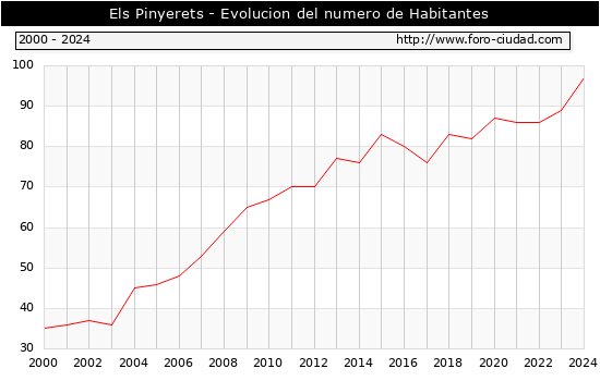 el numero de habitantes en Els Pinyerets era de 97, 8 habitantes mas que el en el año 2023. En el grafico siguiente se puede ver cuantos habitantes tiene Els Pinyerets a lo largo de los años.