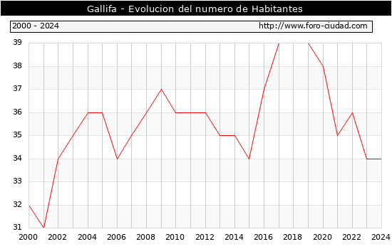 el numero de habitantes en Gallifa era de 34, igual numero de habitantes que el en el año 2023. En el grafico siguiente se puede ver cuantos habitantes tiene Gallifa a lo largo de los años.