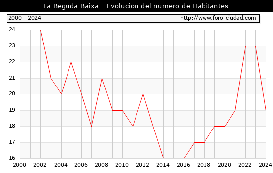 el numero de habitantes en La Beguda Baixa era de 19, 4 habitantes menos que el en el año 2023. En el grafico siguiente se puede ver cuantos habitantes tiene La Beguda Baixa a lo largo de los años.