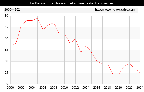 el numero de habitantes en La Berna era de 25, 2 habitantes menos que el en el año 2023. En el grafico siguiente se puede ver cuantos habitantes tiene La Berna a lo largo de los años.