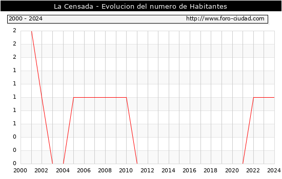 el numero de habitantes en La Censada era de 1, igual numero de habitantes que el en el año 2023. En el grafico siguiente se puede ver cuantos habitantes tiene La Censada a lo largo de los años.