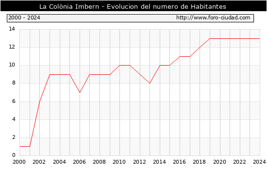 el numero de habitantes en La Colònia Imbern era de 13, igual numero de habitantes que el en el año 2023. En el grafico siguiente se puede ver cuantos habitantes tiene La Colònia Imbern a lo largo de los años.