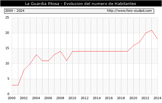 Segun los datos publicados por el INE a 1 de Enero de 2024 el numero de habitantes en La Guardia Pilosa era de 18, 3 habitantes menos que el en el año 2023. En el grafico siguiente se puede ver cuantos habitantes tiene La Guardia Pilosa a lo largo de los años.