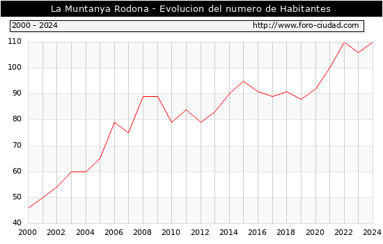 el numero de habitantes en La Muntanya Rodona era de 110, 4 habitantes mas que el en el año 2023. En el grafico siguiente se puede ver cuantos habitantes tiene La Muntanya Rodona a lo largo de los años.