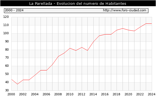 el numero de habitantes en La Parellada era de 112, igual numero de habitantes que el en el año 2023. En el grafico siguiente se puede ver cuantos habitantes tiene La Parellada a lo largo de los años.